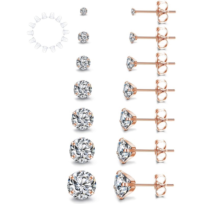 YADOCA 7 Pairs Women's Stud Earrings Silver Cubic Zirconia Stud Earrings Set 316L Stainless Steel Hypoallergenic Unisex Small Sleeping Cartilage Stud Earrings 2-8 mm, Stainless Steel