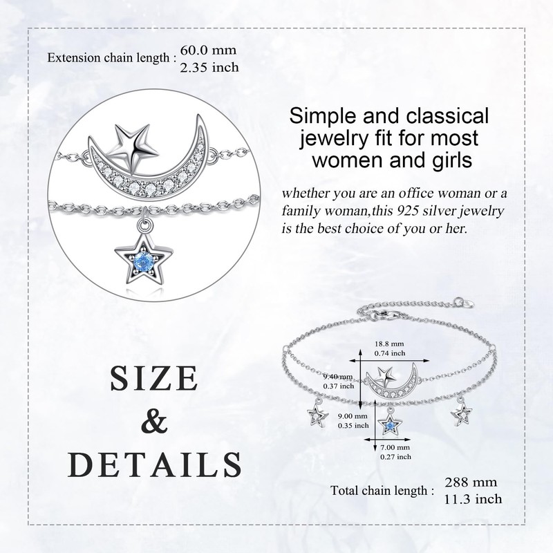 - 💎 Material 💎 The layered moon ankle bracelet is made of 925 sterling silver, hypoallergenic with no nickel, no lead, and is safe for sensitive skin. Sparkling AAA cubic zirconia is used to add the shine of the moon and stars, making the whole silver anklet more eye-catching.