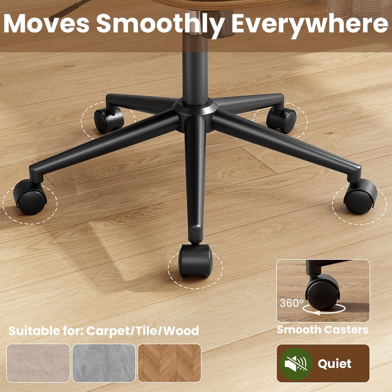 Smooth and Quiet Movement: Equipped with smooth casters, this chair allows for easy and quiet movement across various surfaces, including plush carpets and hard floors, without scratching the floor surface.