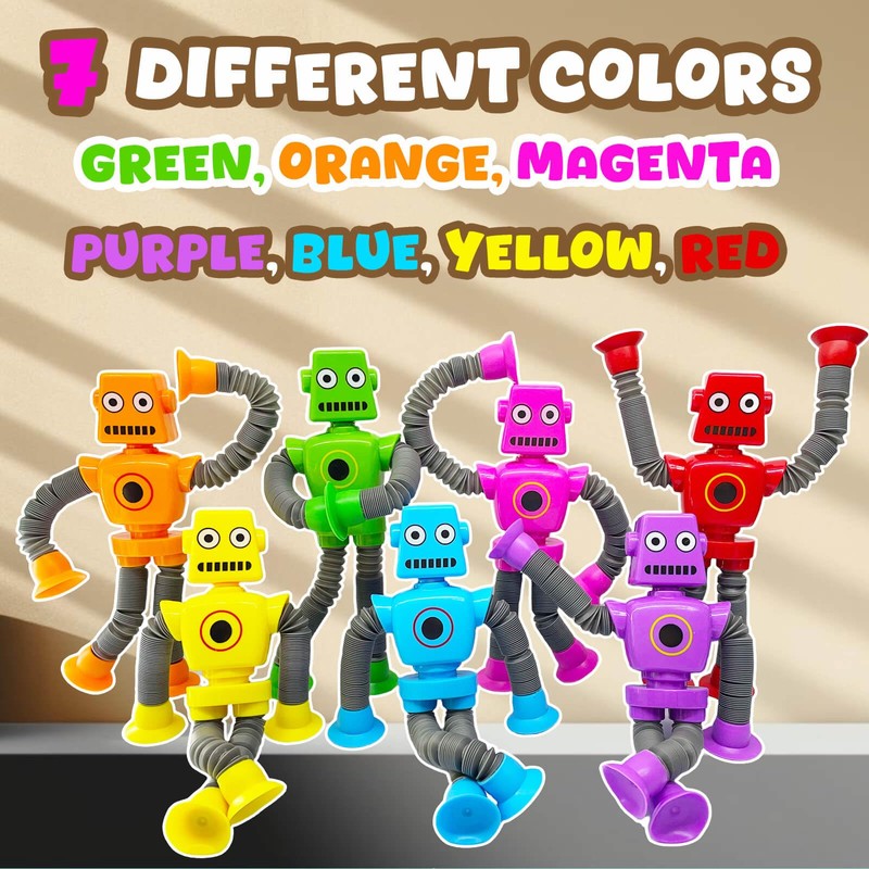 - 😁 Awesome to Keep Kids Occupied: This durable and safe suction fidget robot toys playset is crafted from premium, BPA-free, and non-toxic materials, ensuring safe play for toddlers and children. Each flexible pop tubes robots is carefully inspected. The telescopic pop tubes robot boast smooth edges and sturdy construction that can withstand fidgeting, stretching, pulling, and bending.