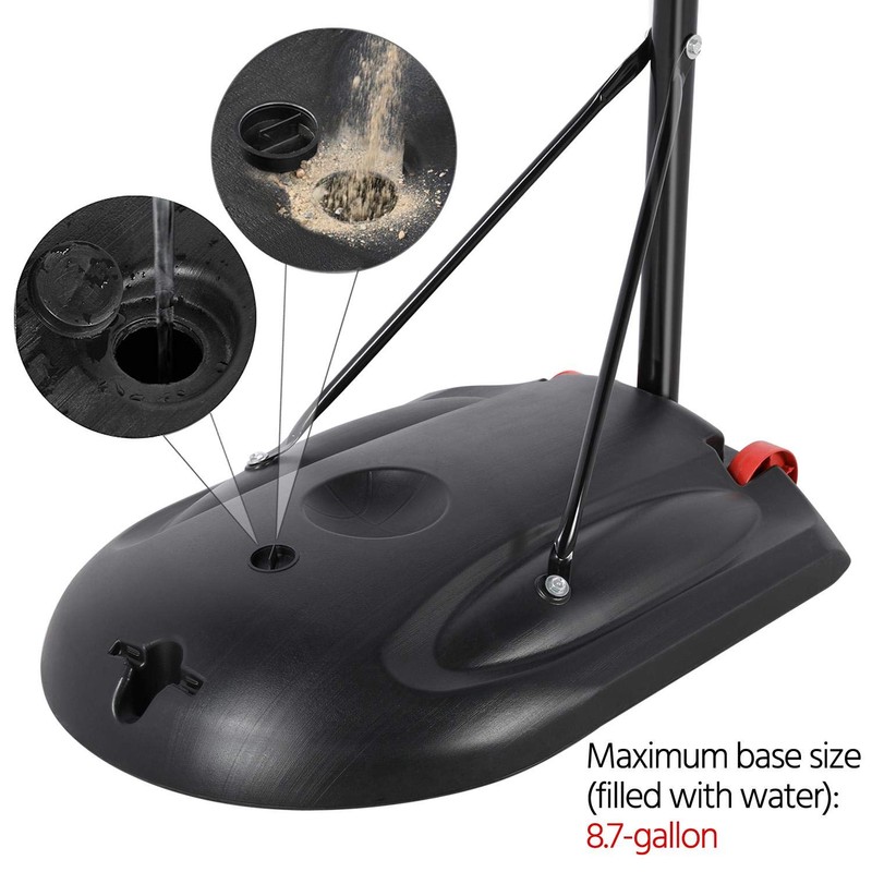 - 🏀Material: painted iron, PE, PVC; Overall dimension: 82 x 56 x (217-277)cm/ 32.5 x 20 x (85.5-109)’’/2.7 x 1.8 x (7-9)ft; Rim height adjustment: incremental 170-230cm/ 5.6-7.5ft; Maximum base size (filled with water): 8.7-gallon