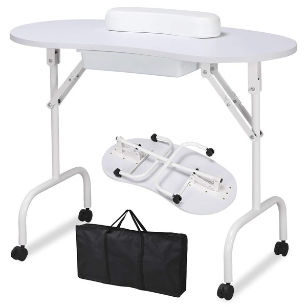 Yaheetech 37-inch Portable & Foldable Manicure Table Nail Desk Workstation with Large Drawer/Client Wrist Pad/Controllable Wheels/Carrying Case for Spa Beauty Salon White, 1 Count (Pack of 1)