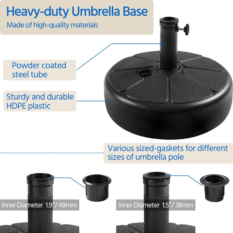 - Water-filled umbrella base: 22L when round base filled with water, which increases weight support capacity and makes this base more sturdy for outdoor patio umbrella