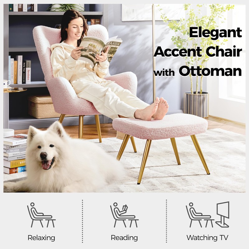 Yaheetech Accent Chair with Ottoman, Boucle Fabric Armchair Footstool, Modern and Cozy Vanity Chair with Golden Legs for Living Room, Lounge, Makeup Room, Bedroom, Pink