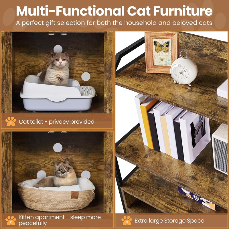 - 【Multi-purpose Design】This versatile cat house serves not only as a concealed haven for your furry friend's litter box or bed but also doubles as a storage cabinet with an industrial and minimalist design that can be seamlessly blended into your bedroom, living room, office, or other limited spaces.