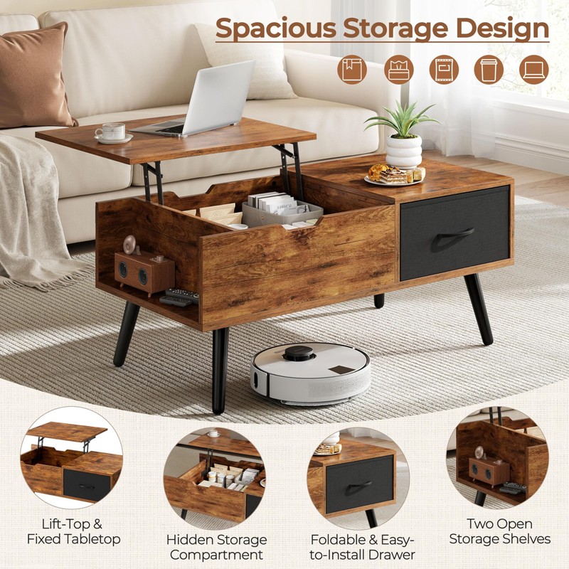 - Effortless Lift-top Design: Lift the tabletop smoothly using gas struts to transform the adjustable coffee table into a work desk or dining area, then close it to conceal clutter, preserving a sleek and tidy appearance all day