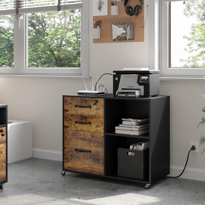 Yaheetech Filing Cabinet with Charging Station Lateral Filing Cabinet Printer Stand for Home and Office Black/Rustic Brown