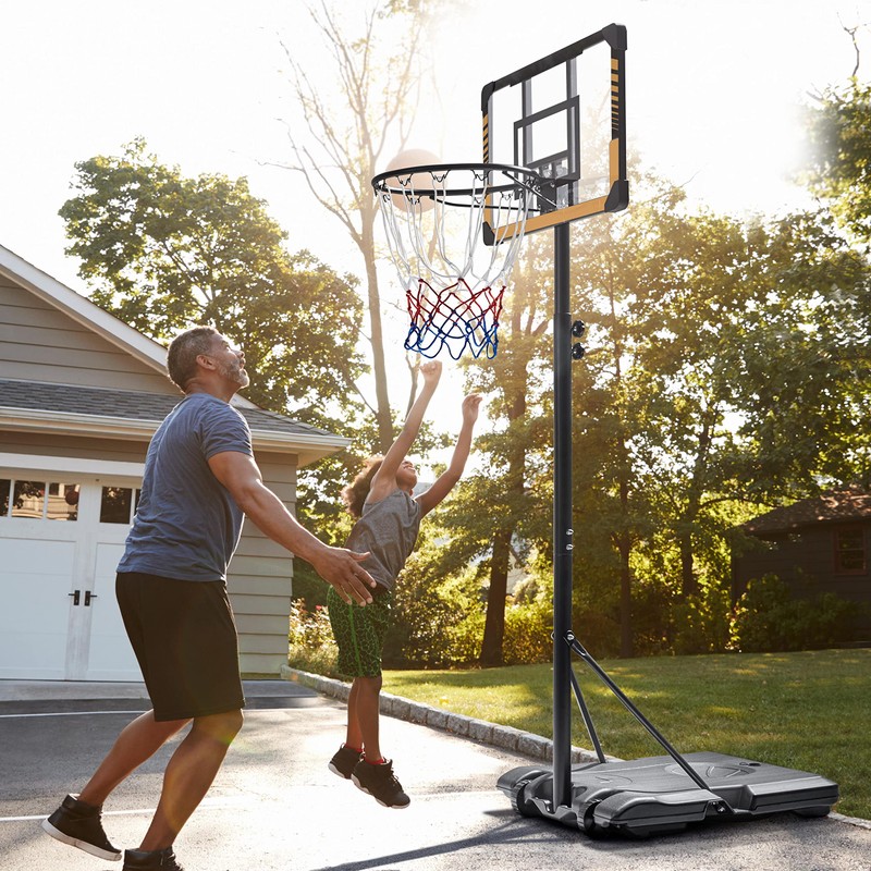 - Built for Outdoors & Indoors: This height-adjustable basketball hoop features a robust powder-coated metal post and a durable 28″ PVC backboard. The weather-resistant materials are ready to withstand the elements and ensure long-term service. An extra basketball net is provided for ease of use