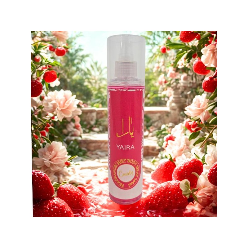 • üç¨ Yaira Candy Body Mist 244ml by Macarena üç¨ YaIra Candy by MACARENA is a sugared-up candy addition to the Yara family. Crafted with the finest ingredients from the USA, it's a harmonious blend of luscious candied fruits and yummy vanilla syrup. Perfect for those who appreciate a well-balanced fragrance. Fragrance Notes: ‚Ä¢ Top Notes: Burst of juicy Green Mandarin and blackcurrant fruits. ‚Ä¢ Heart: Blooming Gardenia & Strawberry Fizz Candy. This exquisite scent is ideal for sophisticated users. The blend offers a unique, balanced aroma experience. YaIra Candy Body Mist comes in a 3.4 OZ bottle. It's a delightful choice for those who enjoy a refined fragrance. The product uses only the described ingredients and notes, ensuring a consistent and appealing scent. Key Benefits & Advantages 1. Unique Candy-Inspired Twist ‚Ä¢ Adds a playful, sweet, and modern candy vibe to the established Yara family of perfumes. ‚Ä¢ Perfect for customers seeking something youthful, fun, and addictive. 2. Premium Quality & Craftsmanship ‚Ä¢ Crafted with the finest ingredients sourced from the heart of the USA, ensuring high-quality composition and lasting performance. 3. Captivating Fruity Opening ‚Ä¢ Opens with a burst of juicy Green Mandarin and blackcurrant, creating a vibrant and refreshing first impression. 4. Sophisticated Sweetness ‚Ä¢ The Strawberry Fizz Candy and Gardenia heart balances sweetness with a floral elegance, appealing to those who want both fun and refinement. 5. Comforting Vanilla Finish ‚Ä¢ The base of yummy vanilla syrup delivers a warm, cozy, and irresistible trail, making it perfect for all-day wear. 6. Versatile & Crowd-Pleasing ‚Ä¢ A well-balanced fragrance that works for both everyday use and special occasions. ‚Ä¢ Appeals to a wide audience thanks to its gourmand fruity-floral profile.