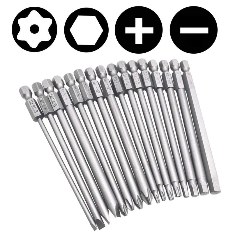 - Length: 4"/ 100mm, Total 16Pcs 4 Different Type Tips: Hex Head Allen Wrench, Torx Security, Cross Phillips & Flat Head Slotted Tip