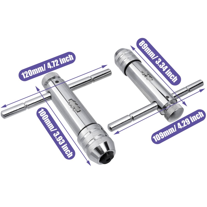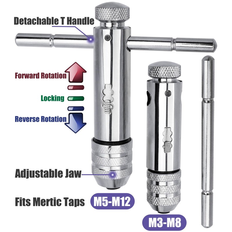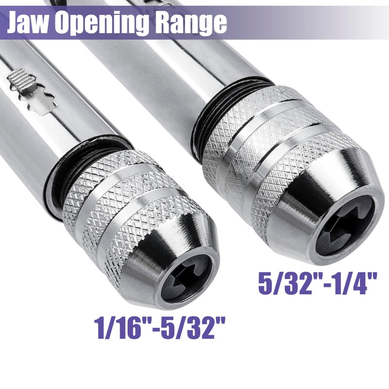 - Adjustable Jaw Design: 1/16" - 5/32" & 5/32" - 1/4" Jaw opening make these ratchet tap wrenches compatible with a wide variety of thread taps, from metric taps M3-M12 to other sizes tap bits up to 3/8".