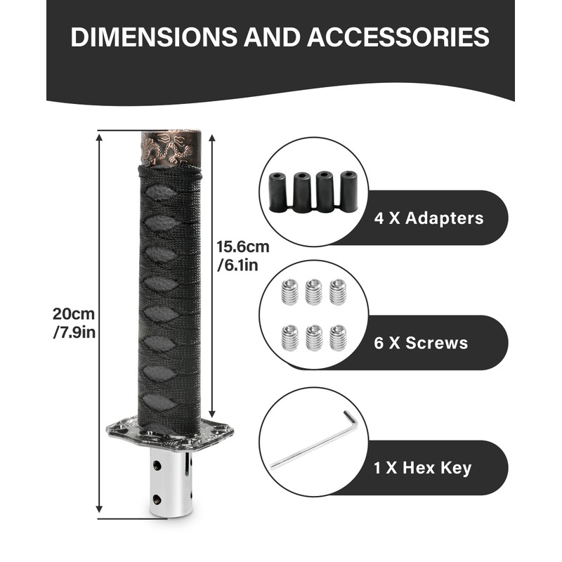 - [Katana Style] The shift knob is designed with classic Japanese woven patterns and vivid dragon patterns. The pattern is domineering and the craftsmanship is exquisite. It is a perfect combination of Bushido and the shifter, making your car cool and unique.