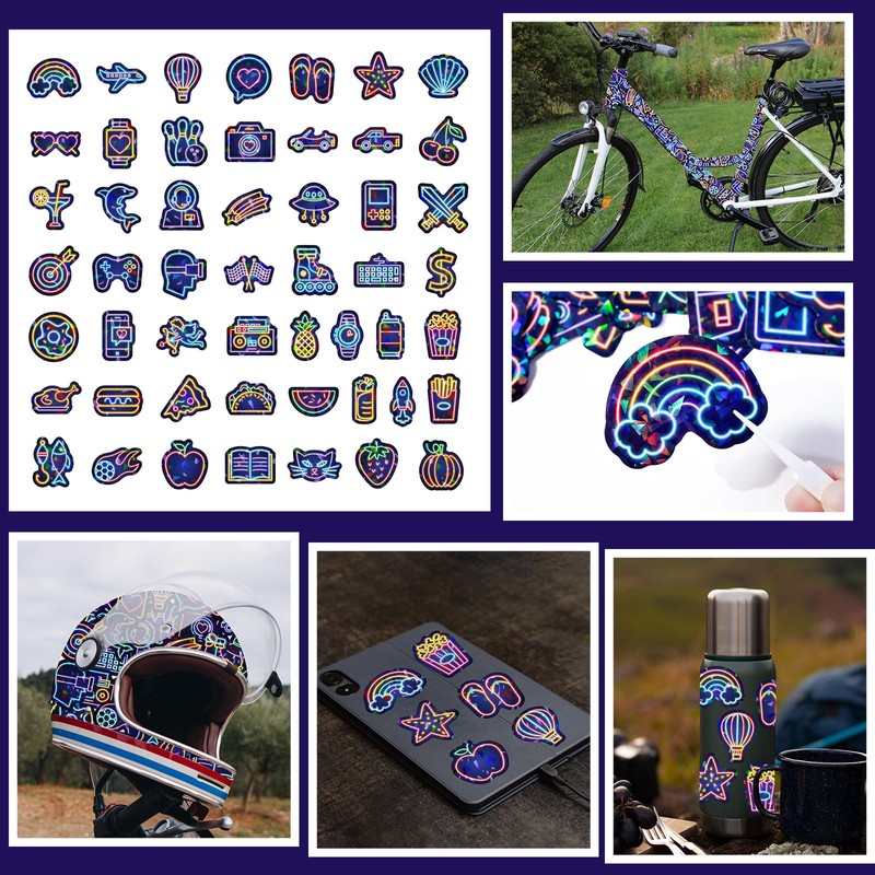 - ✨ Holographic Stickers - Dynamic Color Changes: Stickers feature a holographic flowing dazzle effect that changes iridescence depending on the angle of the light. It adds a magical touch to any surface, making water bottles, laptops, and book covers instantly sparkling and eye-catching.