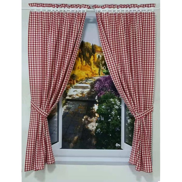 Yaland Curtains with Checked Pattern, Country House Style, Checked Size 1 x 1 cm, Living Room Curtain Scarves with Tiebacks (W x H 80 x 120 cm, Red) Pack of 2