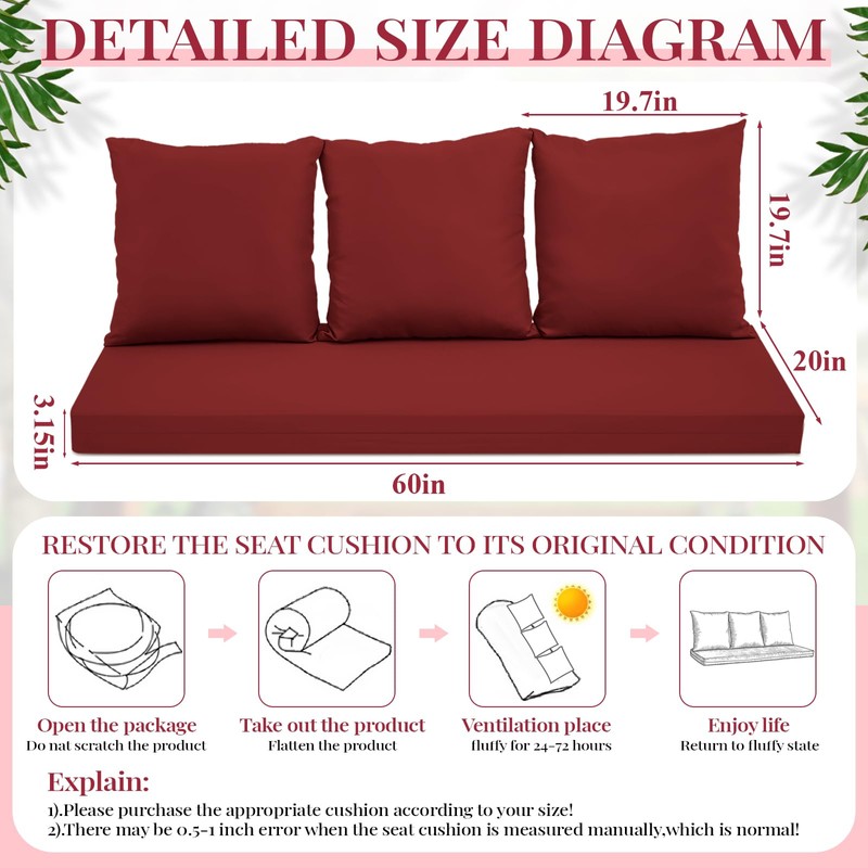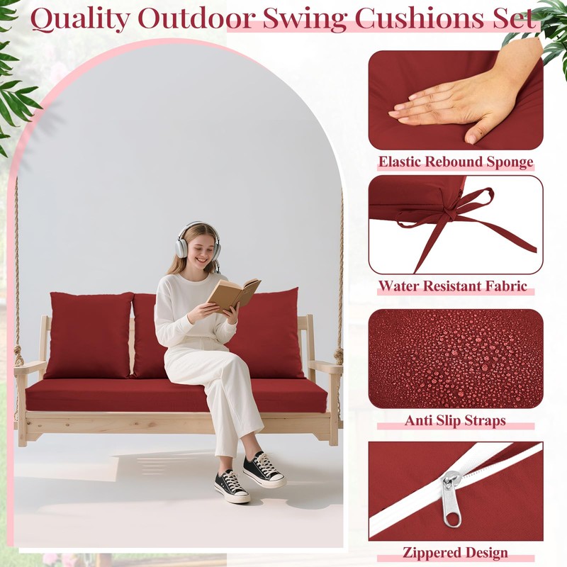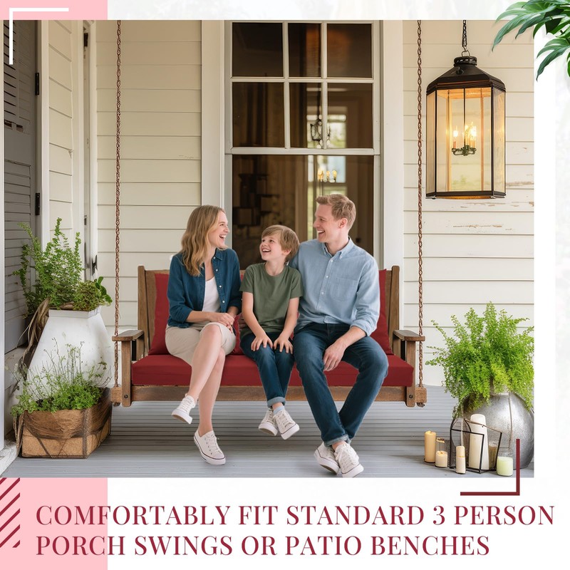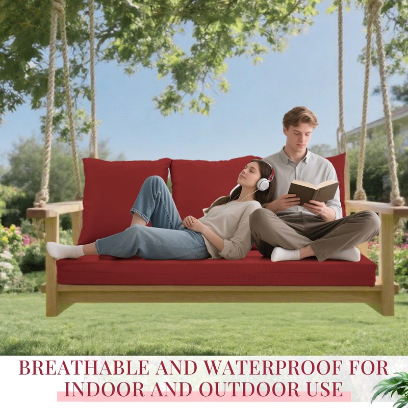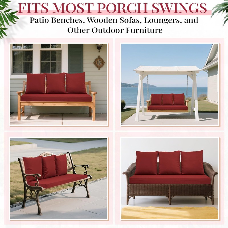 - Outdoor Swing Cushions Set: the package contains 1 piece crimson porch swing cushions 60 inch long and 3 pieces matching back pillows, thoughtfully designed to comfortably fit standard 3 person porch swings or patio benches