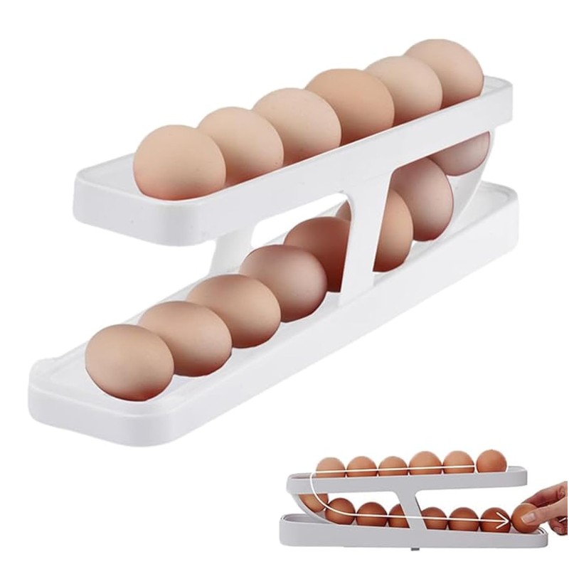 - 【Auto Rolling Egg Holder】:Egg Dispenser features a convenient gravity-fed design. Eggs are dispensed at a time from an inclined track. Take out the eggs from the outlet, and the eggs inside will roll out automatically.