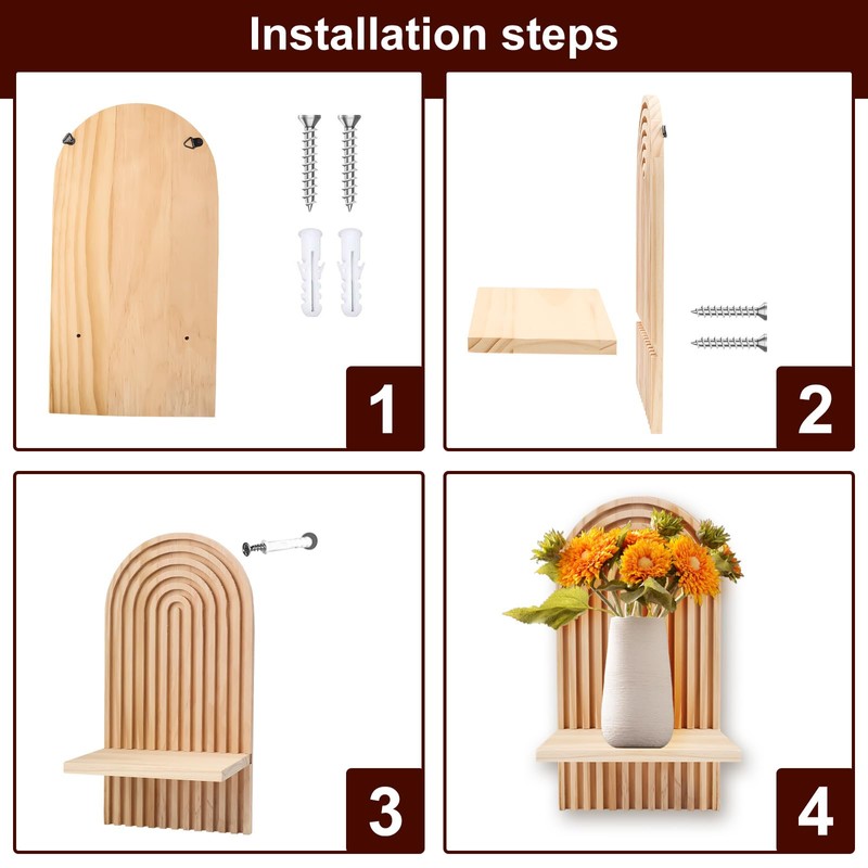 - Easy to install: rainbow decorative boho wood measures 18 x 12 x 34.5 cm (L x W x H), 1.1 cm thick, with a triangular hook on the back for direct hanging. The boho wall shelf wood can be assembled in just 3 steps, there are mounting holes on the surface of the wooden board, with the slot of the fixing plate, you can use our matching screws to connect the wall mount to the horizontal wooden board to increase the stability of the wooden shelf.