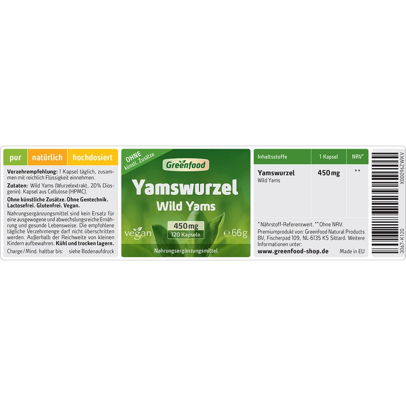 The yam root (Dioscorea villosa) is native to Asia Africa and America. It has been known and appreciated in Chinese natural medicine for over 1000 years. Only Wild Yams is used in Greenfood yam root. Without any additives and, of course, without the use of genetic technology.