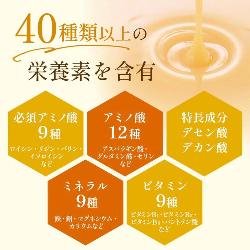 • (Contains more than 40 different nutrients) Royal Jelly contains more than 40 nutrients including amino acids, including proteins, carbohydrates, and fats; and other vitamins and minerals. In addition, Yamada Beekeeper's proprietary enzyme decomposition technology allows the absorption of nutrients of peptide and amino acids to be approximately twice as long