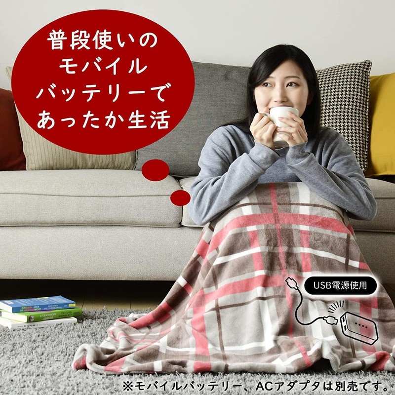 Yamazen YHK-US43(CR) Electric Blanket, Throw Poncho, USB Blanket, 51.2 x 31.5 inches (130 x 80 cm), Auto Off Timer, Washable, Should, Checkered Pattern, Red