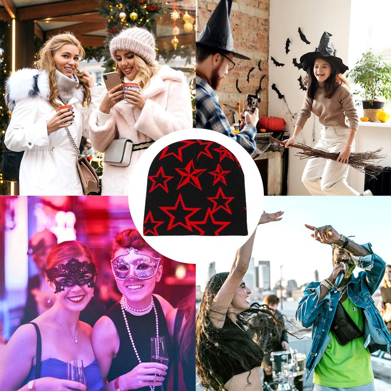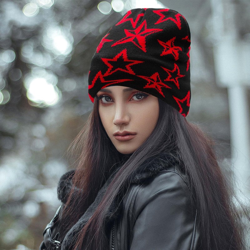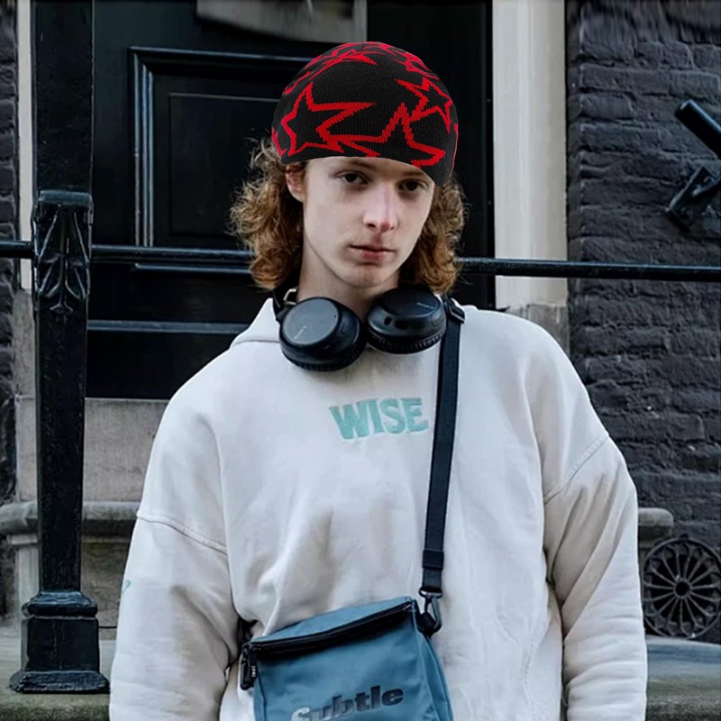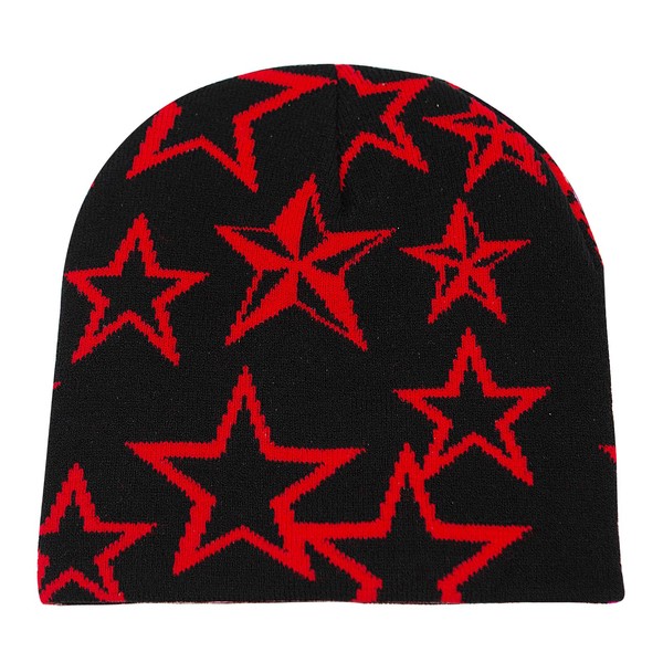 YAMEIZE Trendy Beanie Y2K Star Pattern - Knitted Hats for Women Men Beanie Hat Soft Elastic Slouchy Knitted Cap Winter Skull Cap Outdoor Black Red