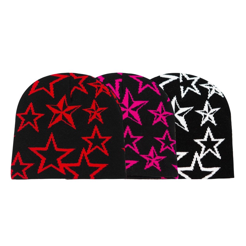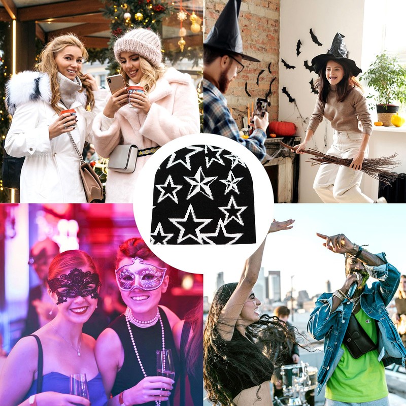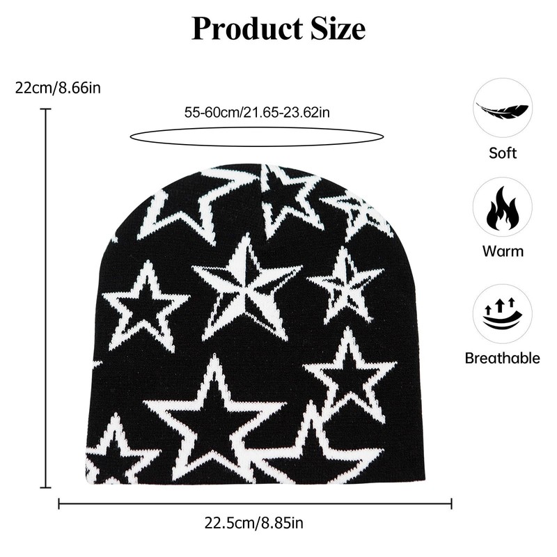YAMEIZE Trendy Beanie Y2K Star Pattern - Knitted Hats for Women Men Beanie Hat Soft Elastic Slouchy Knitted Cap Winter Skull Cap Outdoor Black White