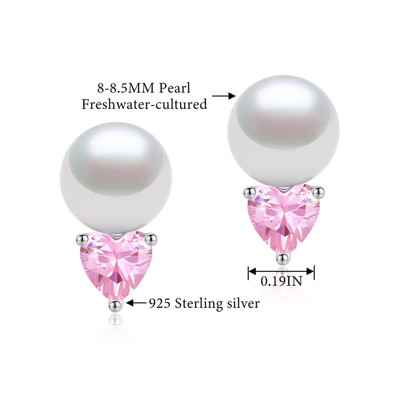 YAMI Pearl Earrings for Women, Pink Heart Zircon with 925 Sterling Silver Stud Earrings, 8-8.5MM Freshwater Cultured Pearls Jewelry Gifts
