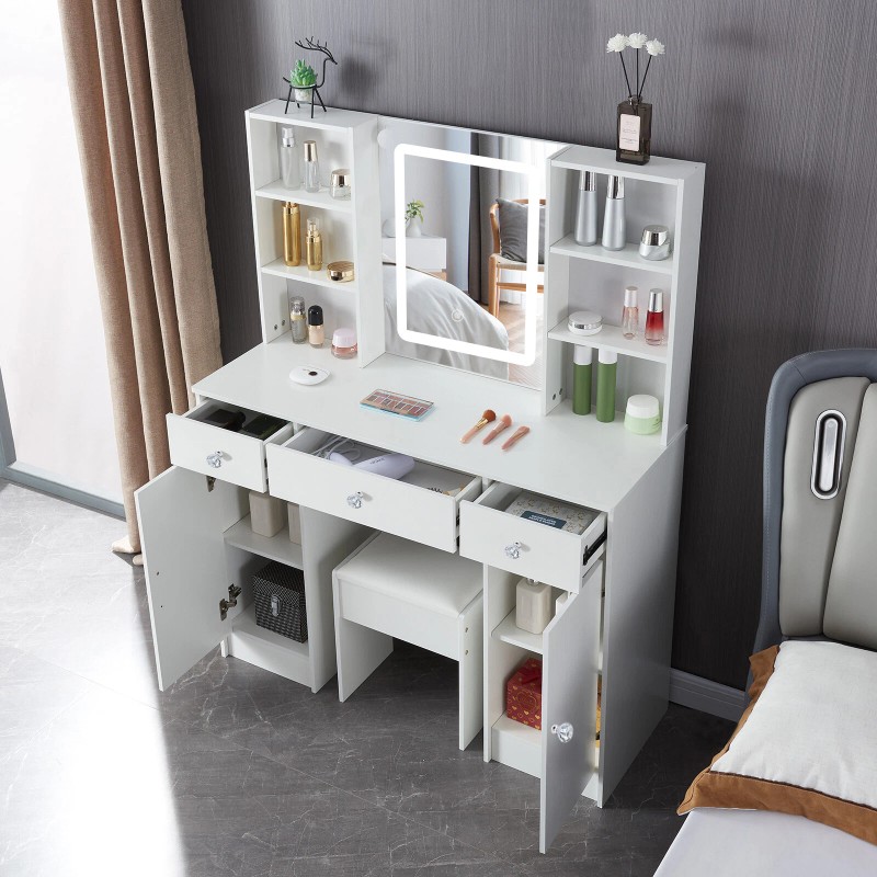 【STORAGE CABINET & DRAWER】The vanity set contains 3 drawers, 4 shelves and two 2-layer cabinets. All your cosmetics and skin care products can be sorted and stored tidily to the vanity table. You can say goodbye to the small and messy table and having a better life with our vanity set.