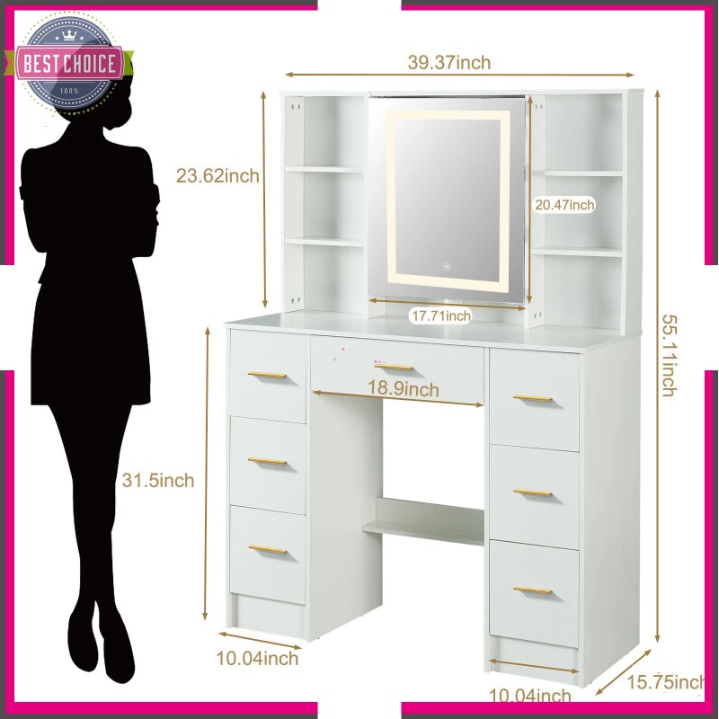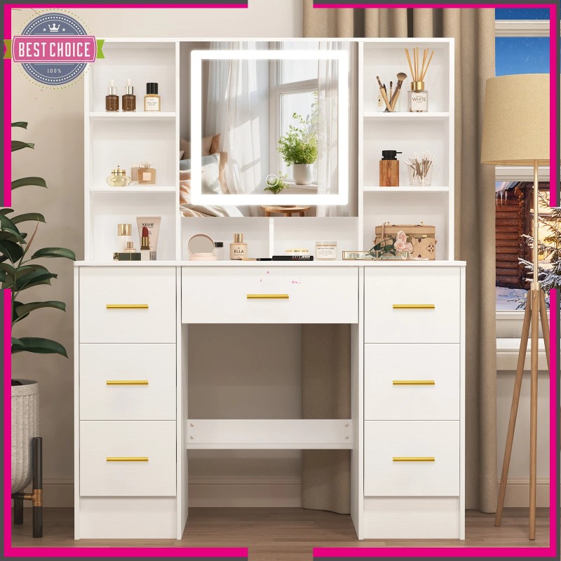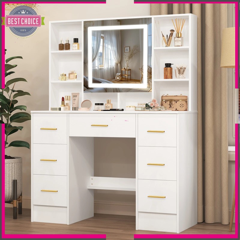 Yamissi Dressing Table with Opened LED Light Mirror and 7 Drawers White Vanit...