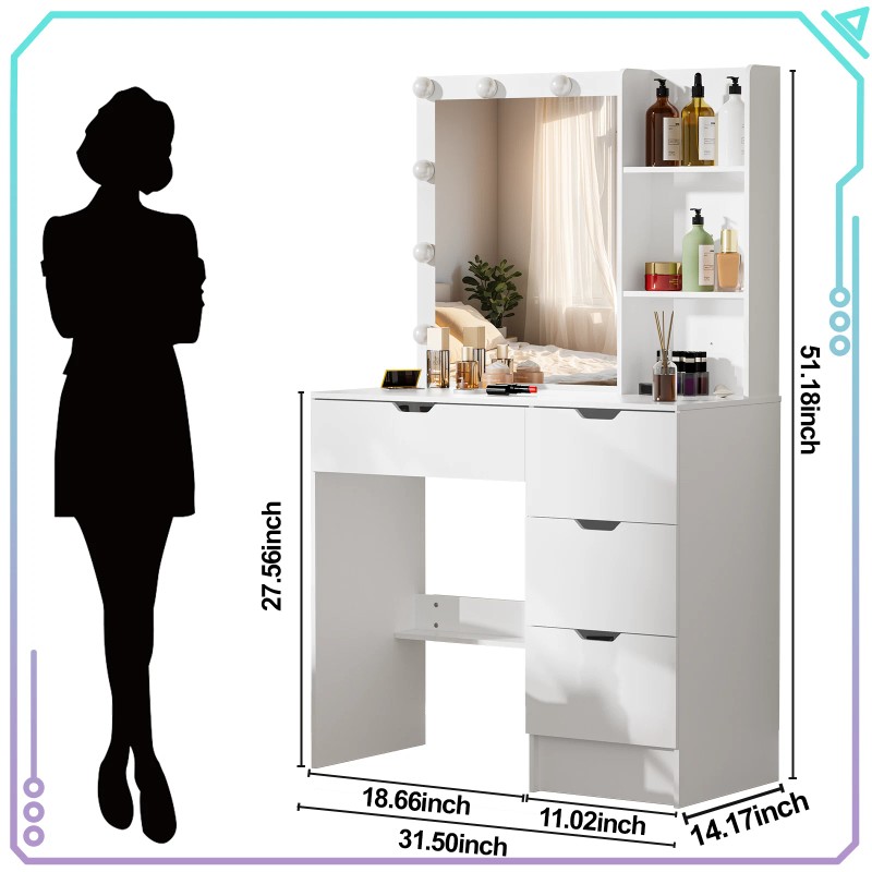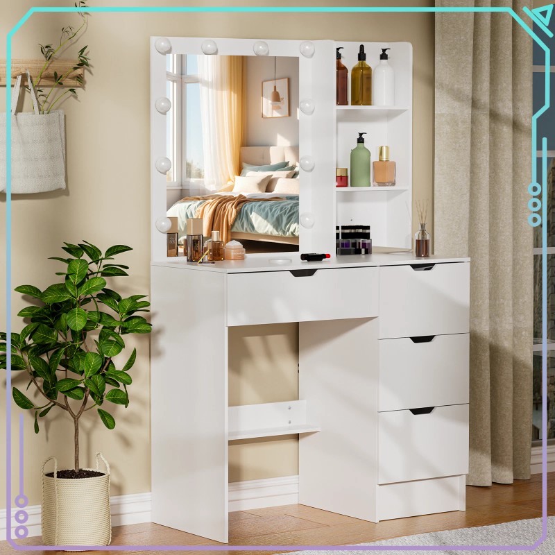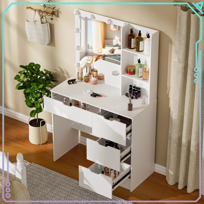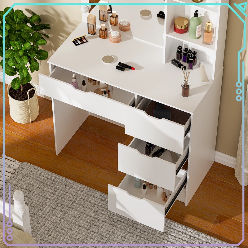Yamissi Vanity Makeup Dressing Table with LED Lighted Mirror and 4 Drawers & Shelves