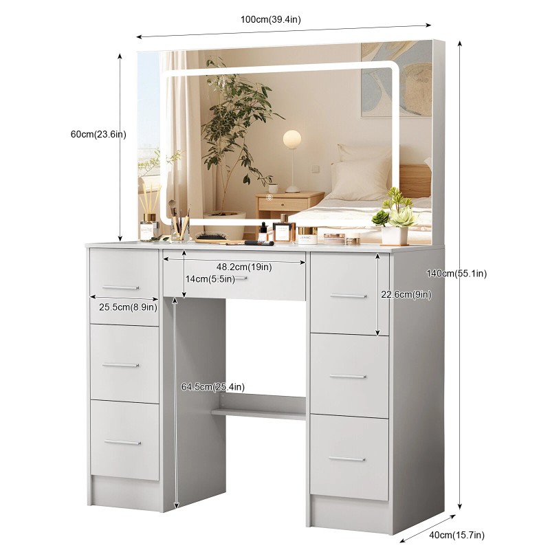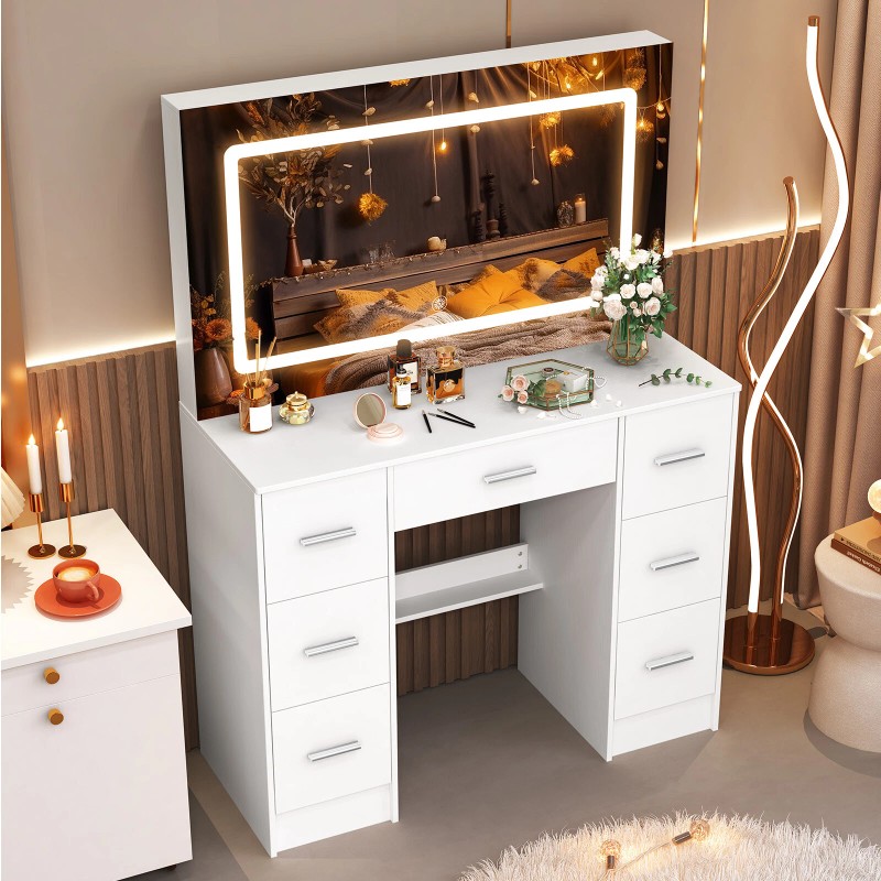 - Features: LED bulb, Mirrored, With Drawers, With Mirror, Flat Pack, Hidden Storage, Large Mirror, 7 Drawers, without stool, 3 Lighting Modes Brightness Adjustable