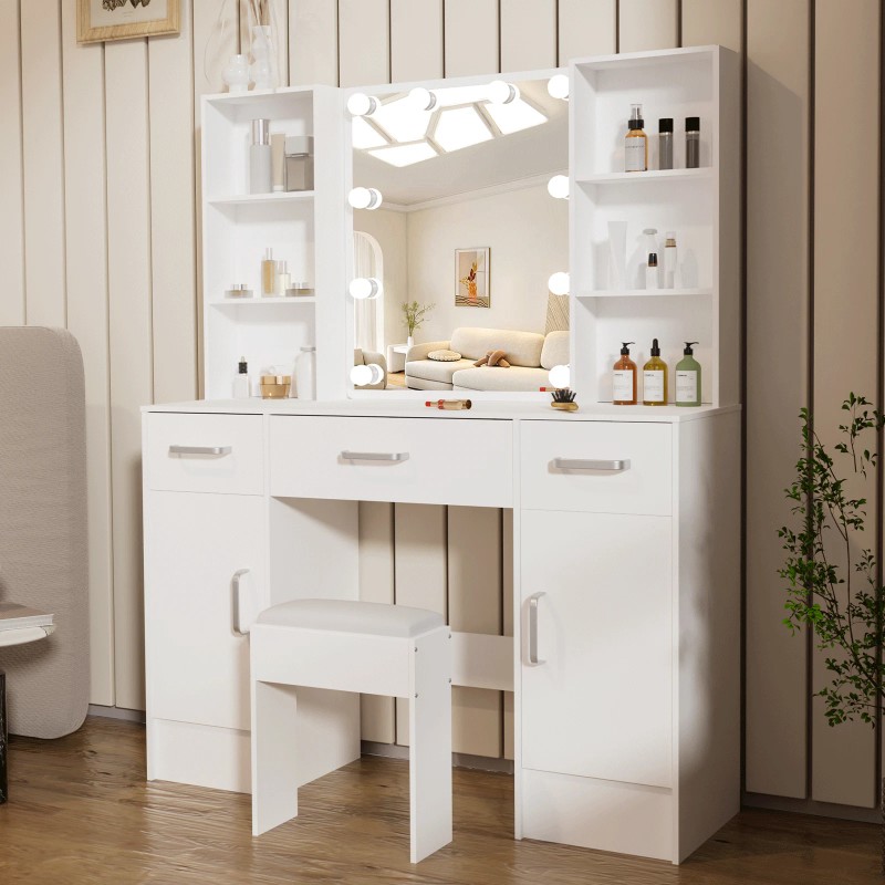 Vanity Table Set with Lighted Mirror Makeup Dressing White with 10 Warm Led Bulb About this item 【STORAGE CABINET & DRAWER】The vanity set contains 3 drawers, 4 shelves and two 2-layer cabinets. All your cosmetics and skin care products can be sorted and stored tidily to the vanity table. You can say goodbye to the small and messy table and having a better life with our vanity set. 【DURABLE MATERIALS & EASY INSTALLATION】 Made fromenvironmental MDF and wood, has great stability and durability, making itelegant. Also, the firm stool possesses excellent load capacity. Detailed and easy-to-follow instruction is made for your assembling it fast and correctly. 【ELEGANT DESIGN 】The elegant design with beautiful lights makes the vanity set aesthetic and functional. What's more, it is of high fitness, perfect for dressing room, bathroom, workplace, hair salon and so on, which is a great gift for your wife, daughter, or girlfriend. Specification:Colour: Warm White + Silver HandleMaterial: MDFOverall dimension(L x W x H): 100 x 40 x 140 cm/ 39.3 x 15.7 x 55.1 inchMirror Size (L x H): 48 x 60 cm/ 18.8 x 23.6 inchStool Size(L x W x H): 36 x 22 x 32 cm/ 14.1 x 8.7 x 12.6 inchStyle: Morden Features: - Padded stool with smooth leather and soft sponge offers optimal comfort. - Primary Material: Manufactured Wood - Adult Assembly Required: Yes - The side storage open shelf creat a easy way to take your cosmetics and keep the all in organized. - Provides a plenty of space for storage and displaying photographs, cosmetic, makeup brush, and other essentials in style - Large tabletop and drawer offiers large space to keep your cosmetics organized. - 【Fascinating Vanity Mirror with 10 LED Bulbs】: This Vanity desk with 3 light color, including warm, daylight and cool lights, allowing you to accomplish a flawless makeup even at night. 10 dimmable Large LED light- Can be touched and does not hurt your skin. Adjustable Light Brightness.- Energy saving and super bright dimmable LED lamps.- Life of light bulbs up to 50,000 hours or more, very durable.3 color temperature modes- White light, neutral light and warm light provided, and gives you suitable light at any time. Package includes: 1 x Mirror 1x 10Pcs Led Lights |