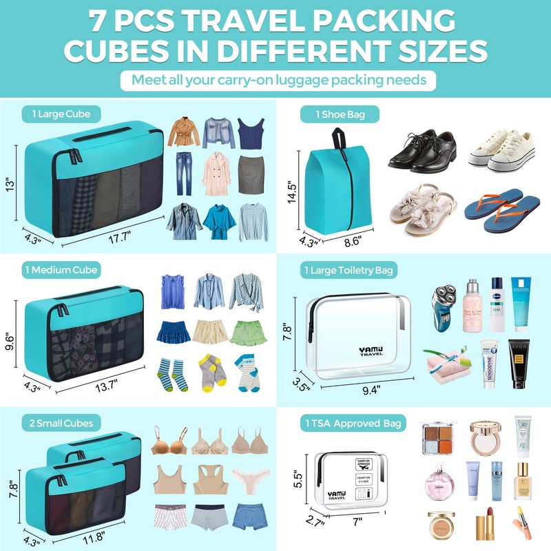 - Meet All Your Packing Needs: Our 7-piece packing cubes for suitcases set includes 4 packing cubes of various sizes to efficiently organize your clothes, 1 shoe bag for your shoes or dirty clothes, 1 large toiletry bag and 1 TSA approved toiletry bag for your cosmetics and toiletries. Make packing a breeze, just like a Mobile Wardrobe, you can pack your entire wardrobe for 7 to 15 days trip.
