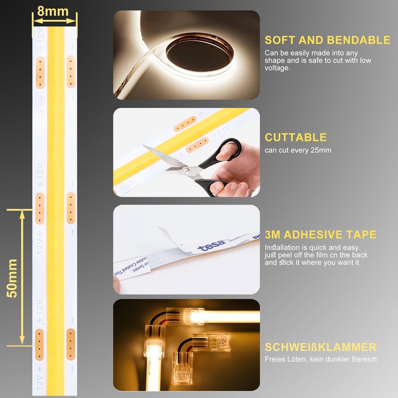 - About light strip: Compared to SMD2835, 5050, 5630 strips, this updated LED strip adopts a new COB design with 320 LED chips per metre board, which can provide 800 lm/m brightness, very energy efficient, more uniform light output, no more worrying about dark spots, soft light and easy to use.