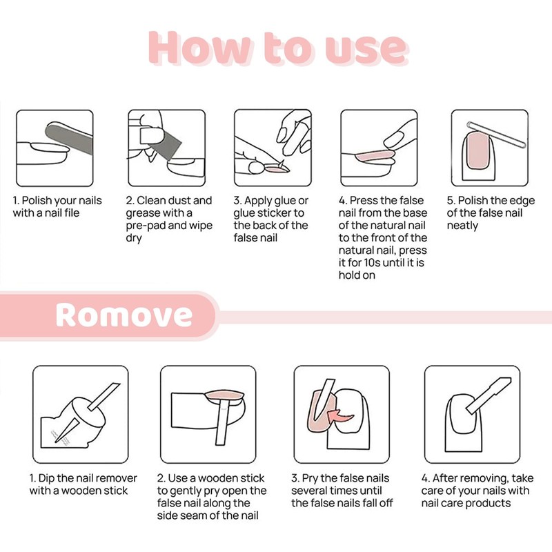• COMPLETE KIT FOR YOUR NAIL CARE This kit contains everything you need to make your nails stylish: 24 pieces press on nails, 1 piece jelly glue, 1 mini nail file and 1 wooden stick. The jelly glue is easy to use and allows you to reuse the fingernails to stick on, which is practical and environmentally friendly.