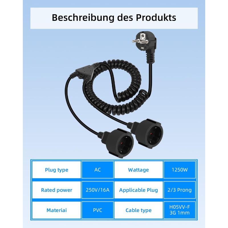 YANBORONSN Spiralverlängerungskabel, 1 bis 2 Schutz-Touchpoint-Spiralkabel, 16A / 250V, Verlängerungskabel mit 2 Steckdosen (1.7M)