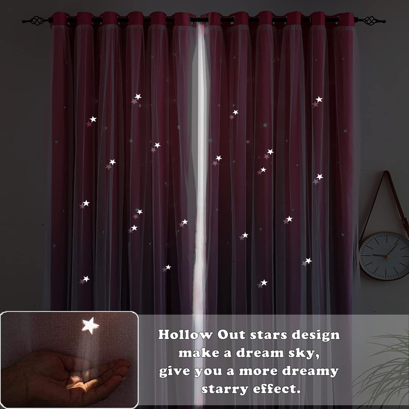- 🦄🌠[STAR DESIGN]: Use high-tech hollow technology cut edges and corners, leaving the star shape intact and clearer. Hollow out the stars in the inner curtain panel, it can form a star spot shot into your room when the light shines in, you will have a lot of stars in the day.