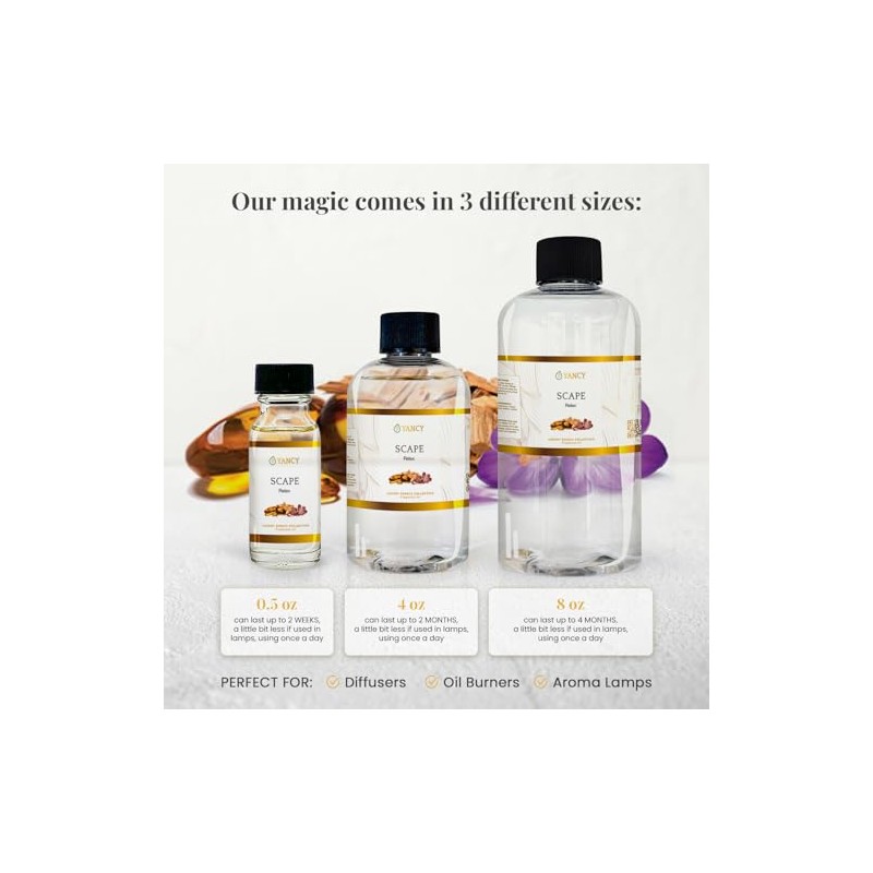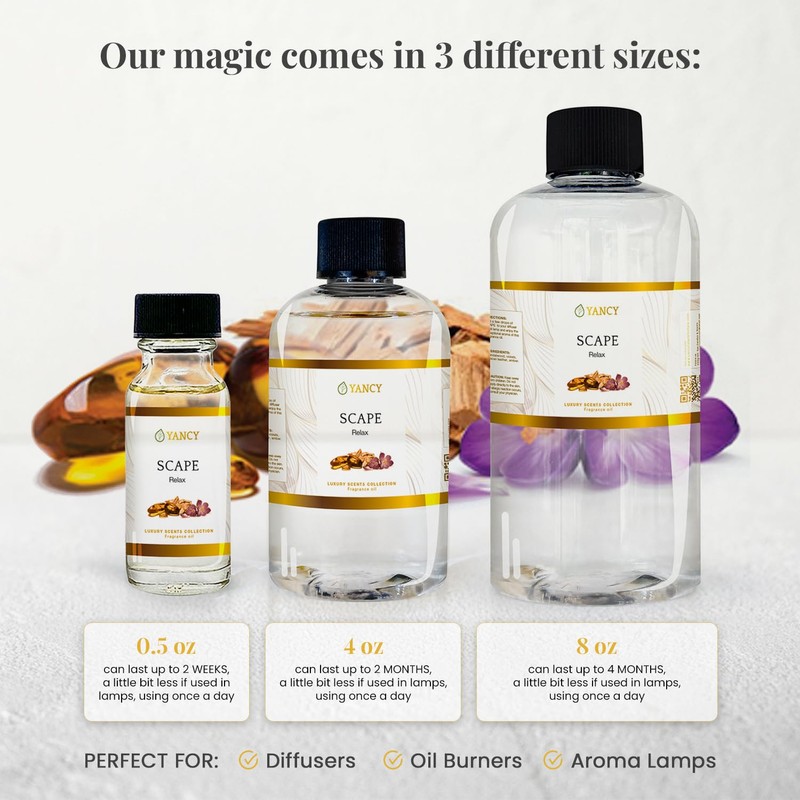 - YANCY Luxury Collection Fragrance Oil - Scape: This unique signature blend stands out for its velvety woody aroma derived from sandalwood, and the strange sensuality of Tuscan leather joined by amber, creating an intricate richness. One of our most beautiful and exclusive fragrances, Scape’s calming effects help set a relaxing environment at home.
