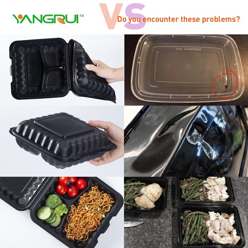 YANGRUI To Go Containers, 65 Pack 7.8 Inch BPA Free Reusable Black Clamshell Food Containers 30 oz Shrink Wrap 3 Compartment Freezer and Microwave Safe Take Out Containers