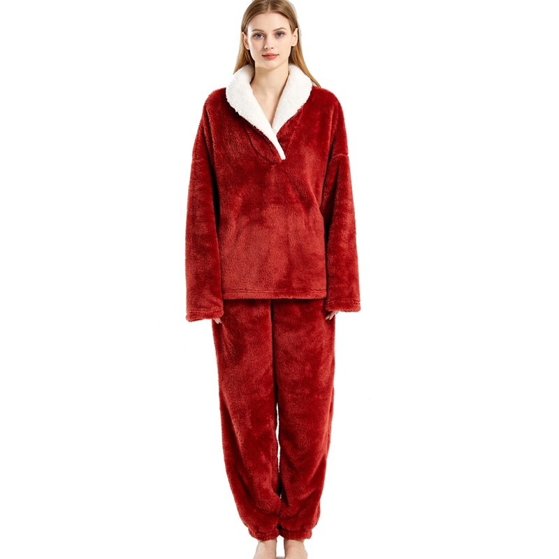 Yanhalo Womens Pyjamas Warm Fleece Pyjamas Set Winter Soft Ladies 2 Piece Nightwear Loungewear Set Longsleeve Top and Thermal Bottoms Pjs Sleepwear with Pocket Red
