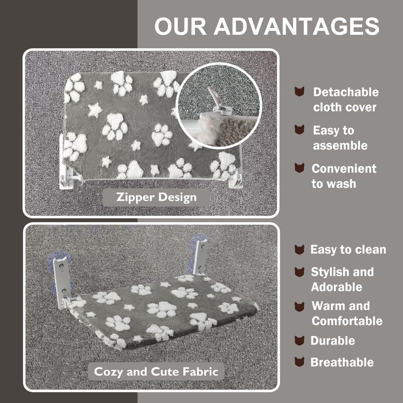 - Stylish and Easy to Clean: The cover is made of soft and warm plush fabric with beautiful jacquard patterns and colors, which is breathable and stylish, and easy to match your home decor to create a fashionable pet corner. Fix the fabric cover on the shelf through a zipper, making it easy to disassemble. When cleaning the cover, it can be removed separately without removing the entire cat hammock
