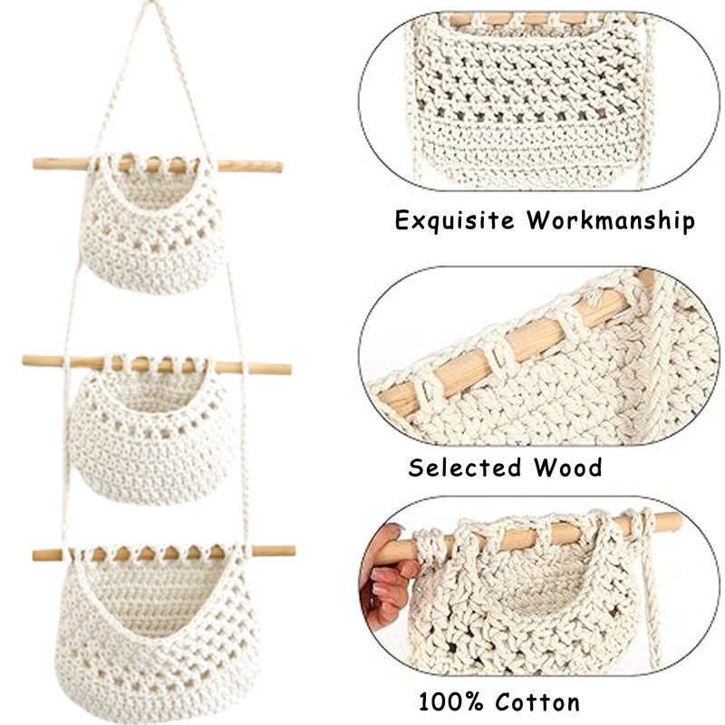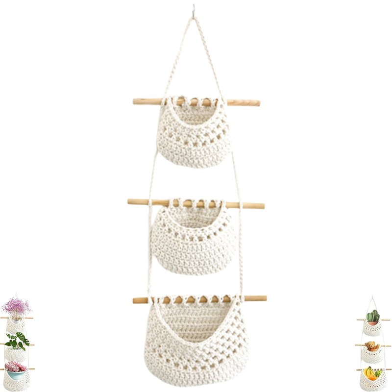 YANJIY Wall Hanging Fruit Basket, Woven Hanging Bag, 3-Tier Hanging Organiser, Bohemian Style Hanging Shelf, Storage Hanging Bag, for Kitchen, Living Room, Bathroom (Milky White)