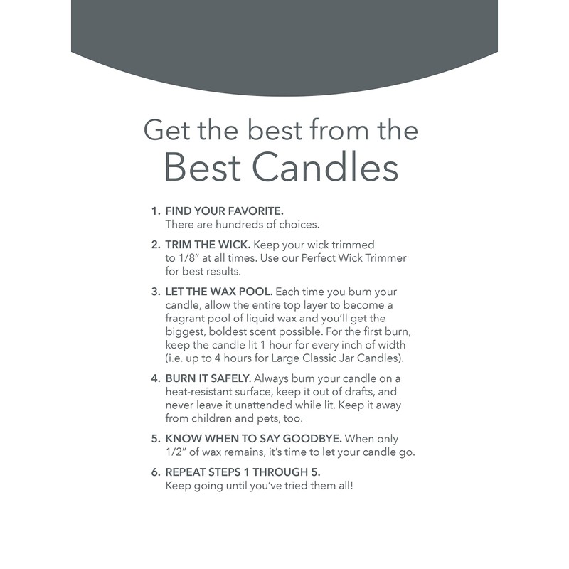 - 100% natural fiber cotton wick straightened and centered for a clean, even burn