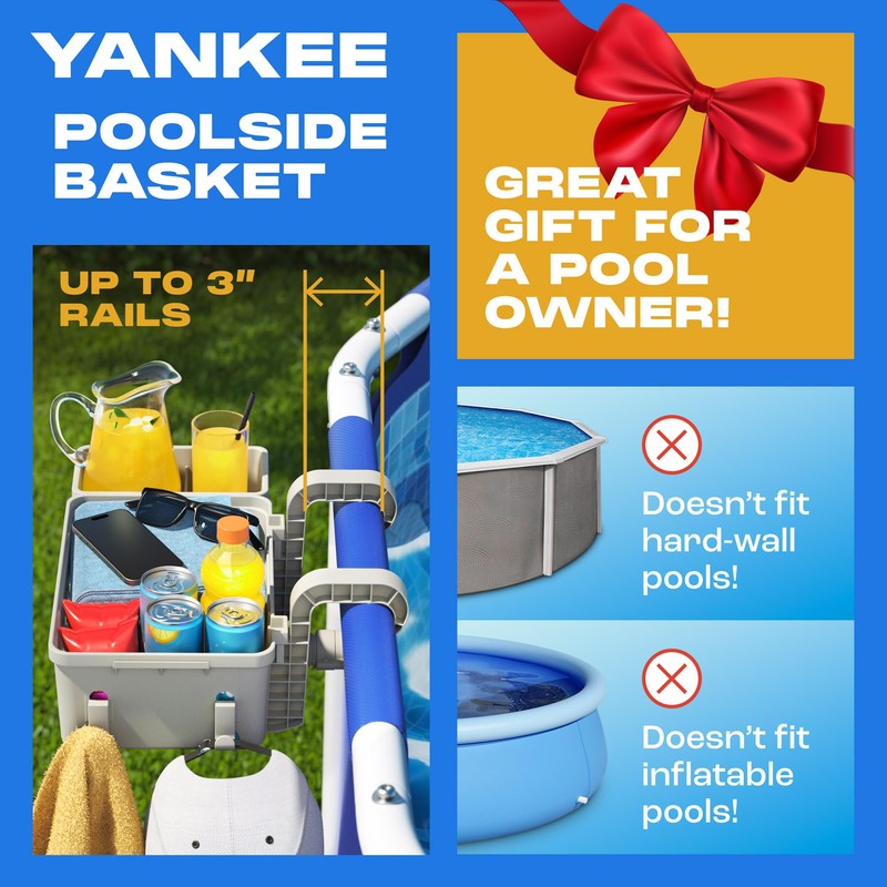 Yankee Poolside Basket for Above-Ground Soft-Wall Pools, Large Pool Basket, 2x Smaller Compartments, 2x Hooks, Pool Bar Regulator, Pools Above Ground Storage, Above Ground Pool Accessories (Gray)