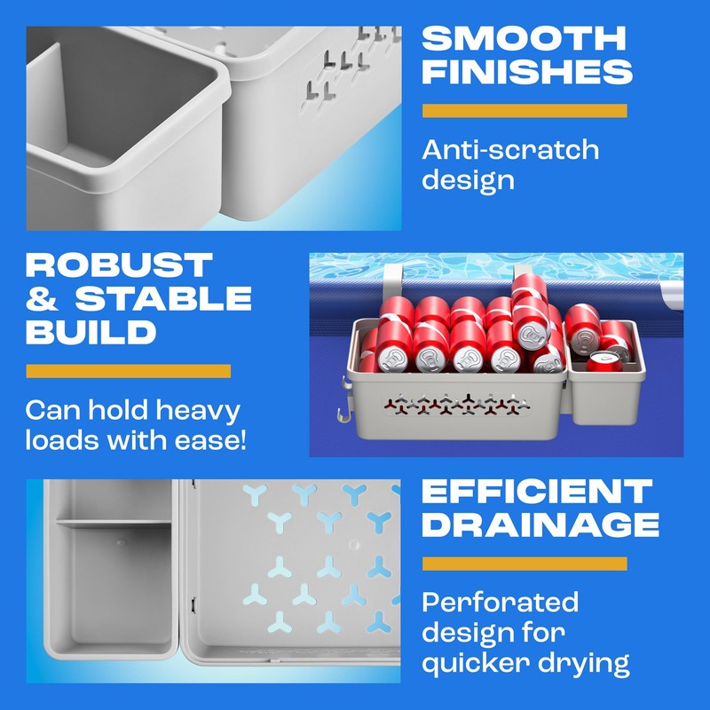 - 💡 WELL THOUGHT-OUT DESIGN. All your poolside accessories will be in the right places: the main perforated compartment ensures proper drainage (load it with ice for the drinks!), and the smaller one is non-perforated for things you want to keep dry