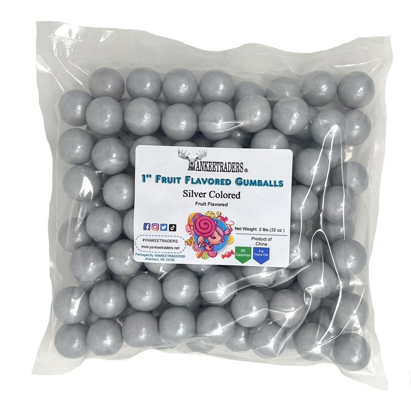 YANKEETRADERS Silver Fruit Flavored Gumballs 1", 2 Pounds Bulk