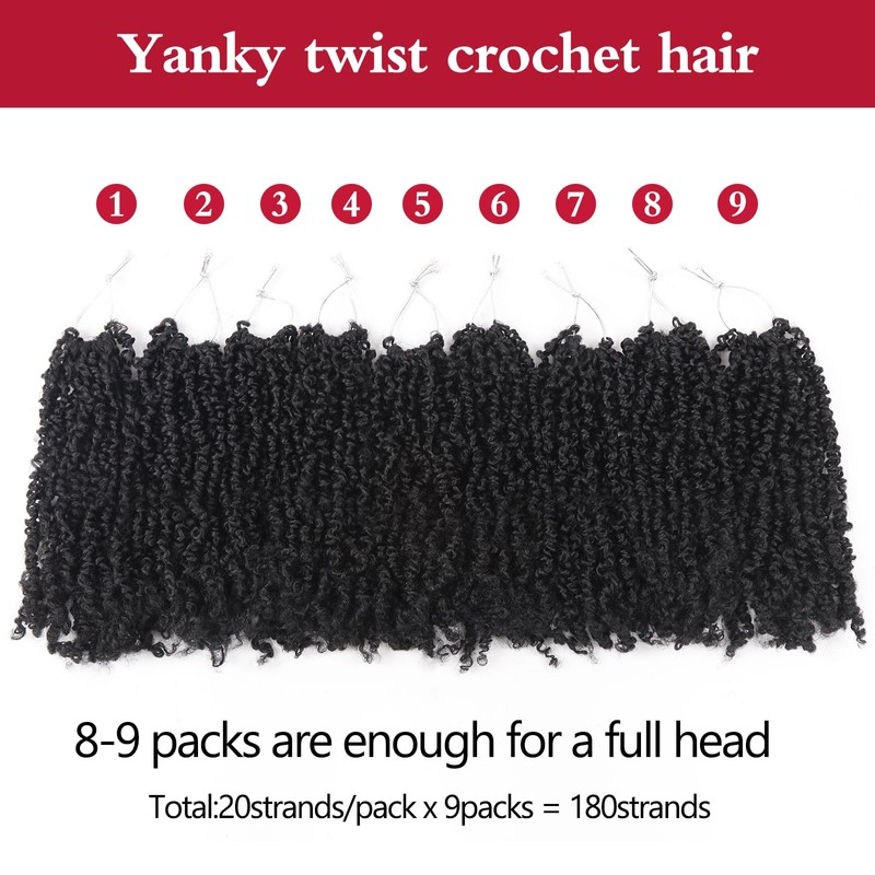- 4.Passion Twist Hair Package: 9 Packs Yanky Twist Crochet Hair, 20 Strands/Pack, With a Crochet Needle,Typically, 8-9 packs of Bohemian Passion Twists are sufficient for a full hairstyle, but you can add more as needed.
