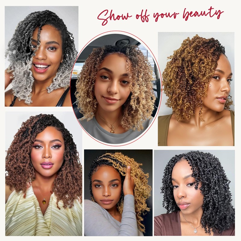 Yanky Twist Crochet Hair is made of high quality synthetic fibers that are skin friendly.100% hand twisted. The ends are cute little curls and all the twists are handmade to create a unique and natural Yanky Twist Hair. Pre-rolled Yanky twist curls are easy to install, you can easily DIY all kinds of Yaki Twist Crochet Hair at home, and all kinds of hairstyles look fluffy, natural and beautiful.Yaki Twist Hair light texture of the hair ensures a comfortable fit and does not weigh down the original hair, making it feel great to wear. Passion Twist Hair is versatile and can be used for traveling, weddings, graduation ceremonies and many other occasions, you can create daily hairstyles or elegant hairstyles for attending parties.