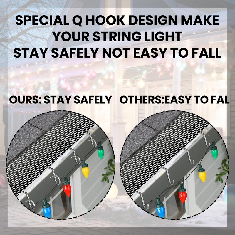 - Q Hook Design: the unique Q hook design of these stainless steel Christmas light hooks ensures a secure grip on your decorations; The curved shape prevents hanged items from sliding, providing a safe environment for your Christmas decor