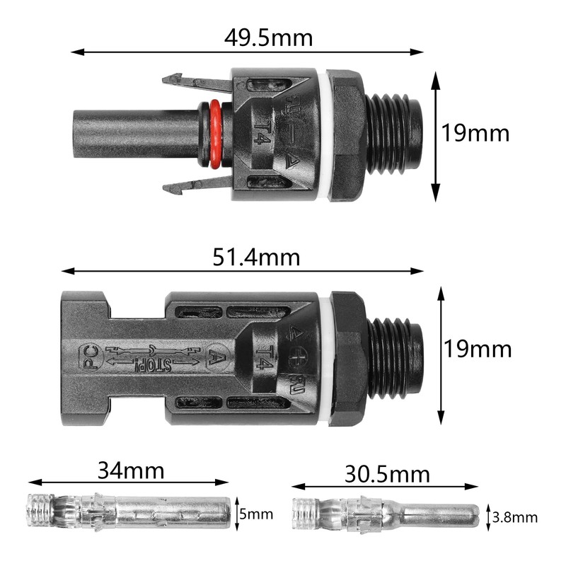 - Compatibility range: photovoltaic solar connectors are compatible with solar cables of different diameters 2.5mm²- 6mm²/ 14AWG-10AWG), plug resistor 1mm Ω, voltage rating 1000V DC, current rating ≤30A. solar cable connectors have good compatibility and high load capacity
